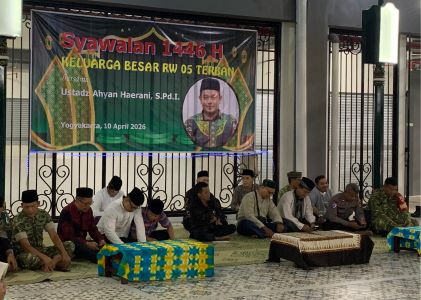 Warga RW 05 Terban, Gondokusuman, berkumpul dalam momen Syawalan 1447 H di Aula Pasar Terban, Jumat (10/4/2026). Pertemuan itu tidak sekadar menjadi ajang saling memaafkan, tetapi juga ruang bertemunya gagasan, harapan, dan kekuatan sosial warga.
