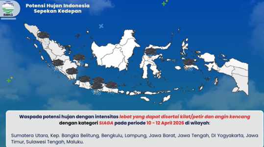 Untuk periode awal, 10–12 April, sebagian besar wilayah Indonesia diprakirakan mengalami hujan ringan hingga lebat.