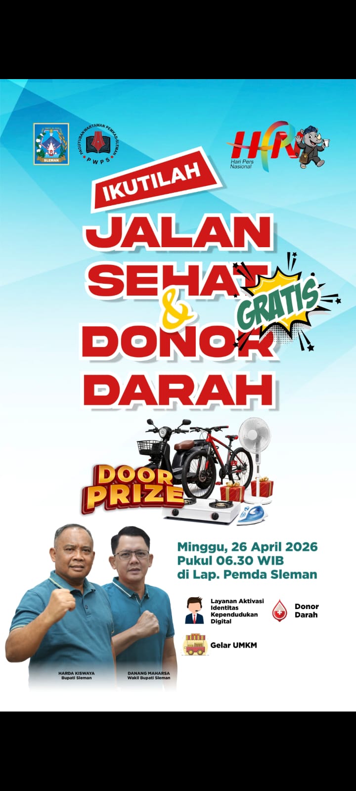 SLEMAN, voicejogja.com – Memperingati Hari Pers Nasional, Pemkab Sleman menggandeng Paguyupan Wartawan Peliput Sleman (PWPS), PMI Sleman dan Baznas Sleman untuk menggelar Jalan Sehat dan Aksi Sosial Donor Darah. Mengusung tema nasional “Pers Sehat, Ekonomi Berdaulat, Bangsa Kuat”, momen puncak peringatan HPN Tahun 2026, akan menggelar kegiatan Jalan Sehat dan Bakti Sosial, dipusatkan di Lapangan Pemda Sleman pada Minggu pagi (26/4/2026) mendatang.
